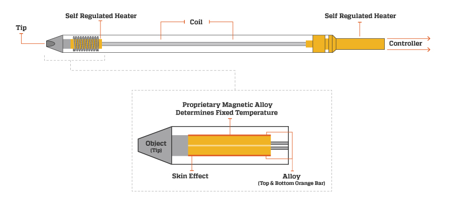 The Metcal® cartridge is made of a heater of proprietary design, consisting of a non-heating copper core and an outer heating layer of magnetic alloy. The composition of the alloy predetermines the tip temperature.