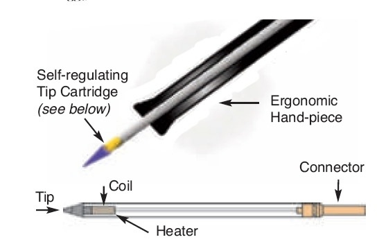 The selection of a material with a fixed Curie point results in a heater that will produce and maintain a specific, self‐regulated temperature; and a heater that requires no calibration and responds directly to thermal loads. When a thermal load is applied to the tip, the heater temperature drops, and the power supply responds with the power required to correctly solder the joint on the board.